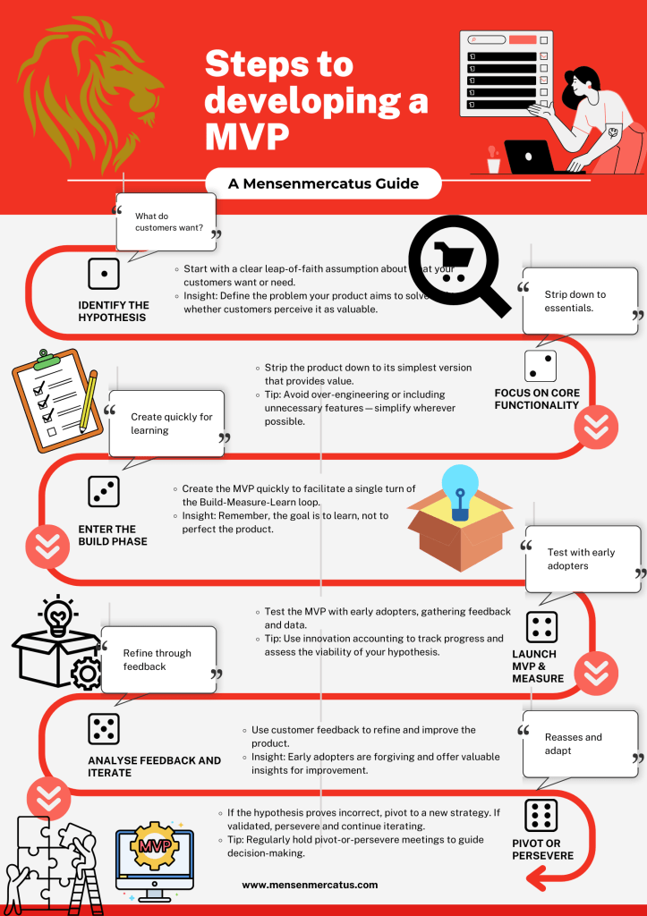 The Minimum Viable Product (MVP) is the cornerstone of the ´Lean methodology´, enabling quick learning and allowing startups to outpace competitors. An MVP is an overly simplified version of a product or service designed to test customer opinions and fundamental business hypotheses while delivering real value to early adopters. It facilitates quick entry into the Build phase and enables startups to measure its impact with minimal effort and development time. By selling prototypes and analysing customer feedback, startups can avoid building something nobody wants. The MVP propels the loop of Build-Measure-Learn, ensuring iterative improvements.